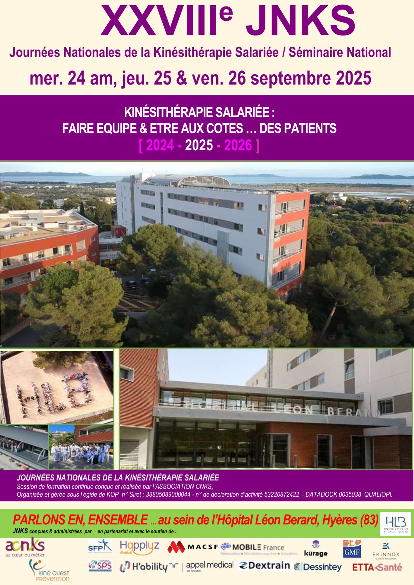 Ce 28ème Séminaire National, organisé par l'Association Collège National de la Kinésithérapie Salariée, a eu lieu à l’Hôpital Léon Bérard (établissement FEHAP), les mercredi 24 après-midi, jeudi 25 et vendredi 26 septembre 2025.