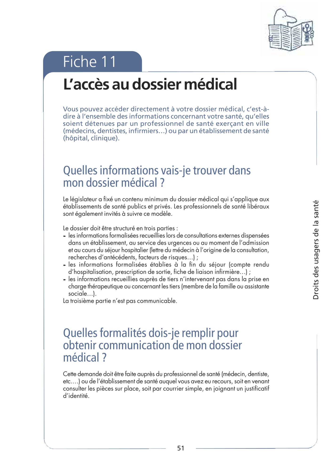 Conformément à la Loi n° 2002-303 du 4 mars 2002 relative aux droits des malades et à la qualité de système de santé, et au Décret n° 2003-462 du 21 mai 2003 relatif à l’accès aux informations personnelles détenues par les professionnels et les établissements de santé, le patient peut, dans les conditions prévues, avoir accès à son dossier médical et se faire communiquer à lui-même, ou à un Médecin qu'il a désigné par écrit, une copie des pièces de son dossier médical.