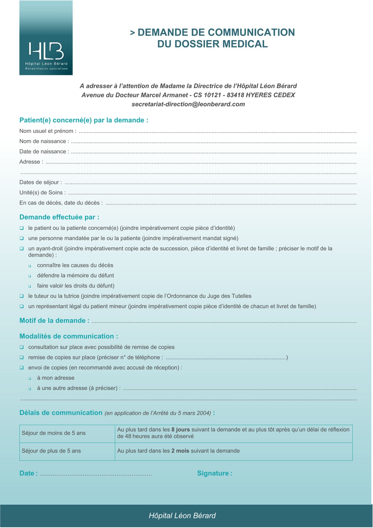 Il doit adresser une demande écrite à la Directrice de l’Hôpital Léon Bérard accompagnée d’un justificatif de son identité (copie de la Carte Nationale d’Identité par exemple).