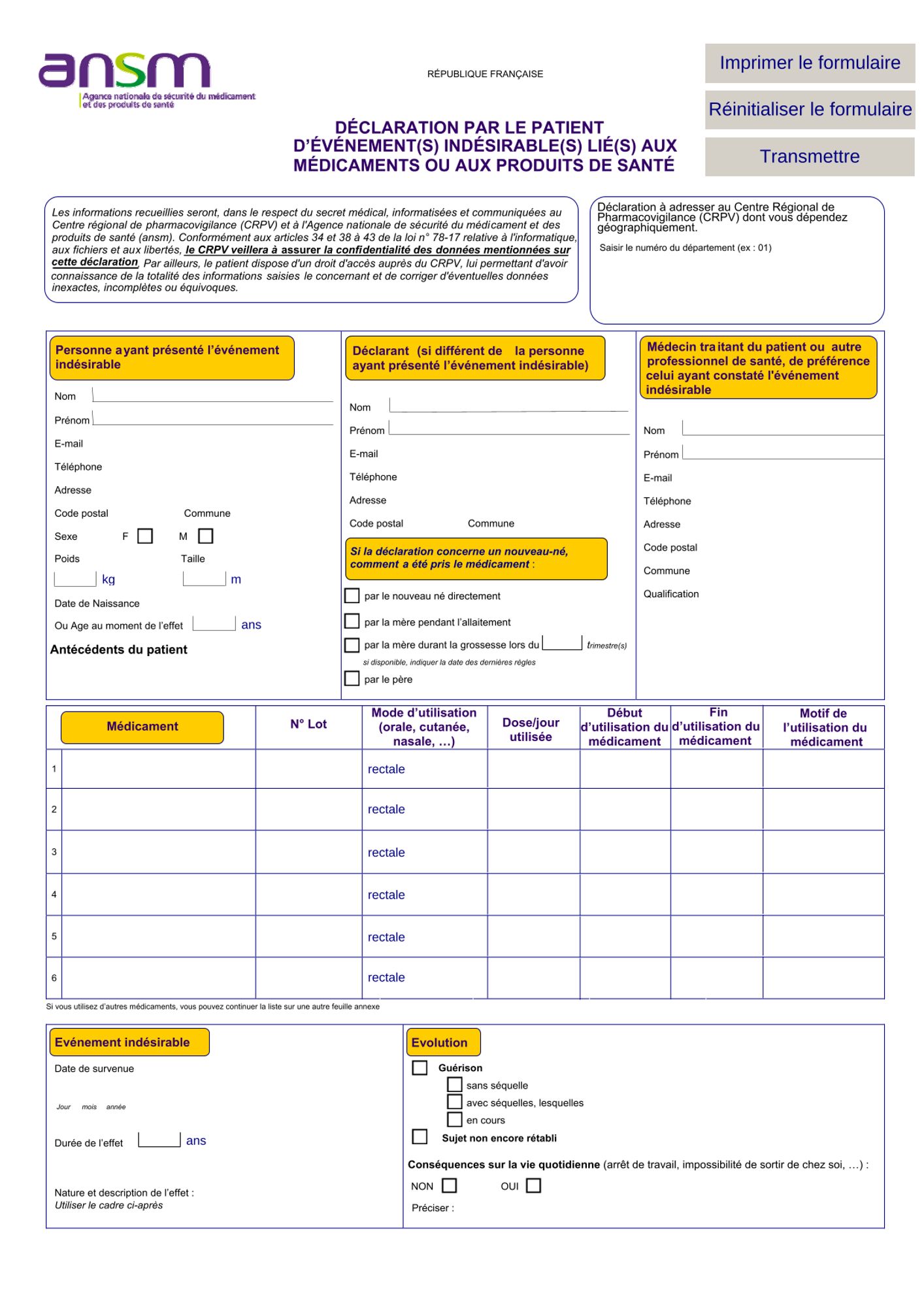 Par ailleurs, depuis le 8 novembre 2012, conformément aux dispositions du Décret n° 2012-1244 relatif au renforcement des dispositions en matière de sécurité des médicaments à usage humain soumis à autorisation de mise sur le marché et à la pharmacovigilance, modifié par le Décret n° 2013-923 du 16 octobre 2013, les patients ont la possibilité de déclarer les effets indésirables qu'ils suspectent d'être liés à l'utilisation d'un ou de plusieurs médicaments.