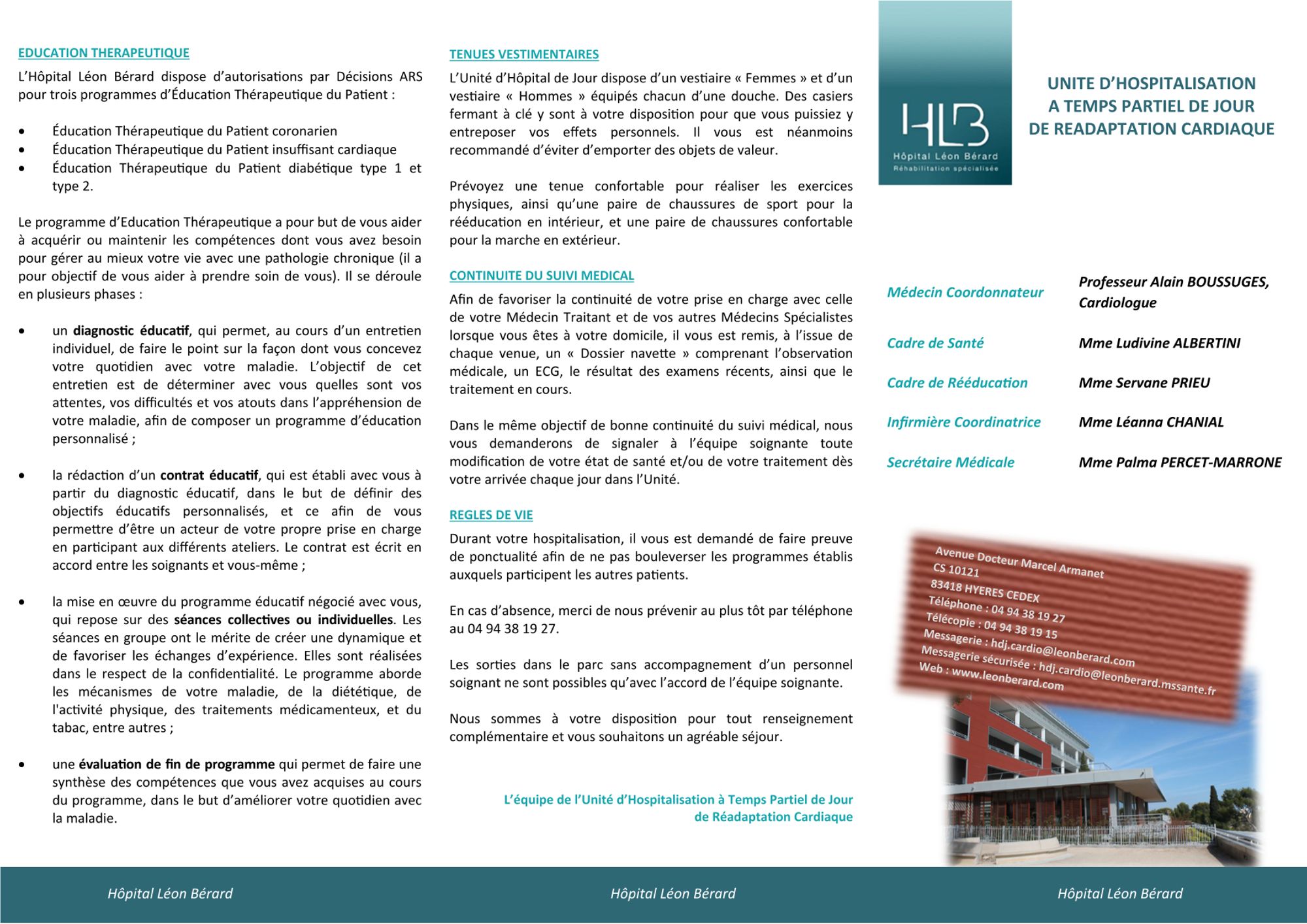 Pour obtenir des renseignements en vue d'une admission dans l'Unité d'Hospitalisation de Jour de Réadaptation Cardiaque, contacter le Secrétariat Médical au 04 94 38 19 27.