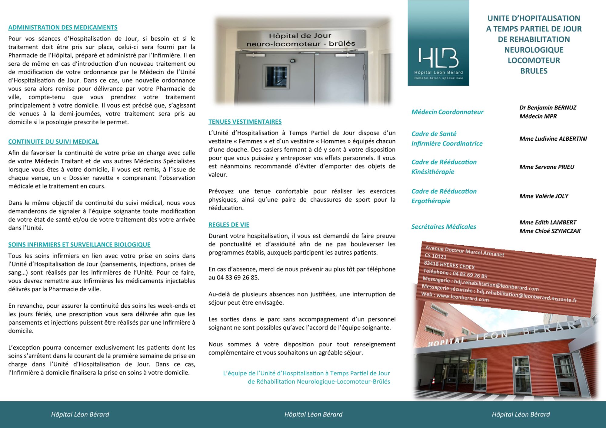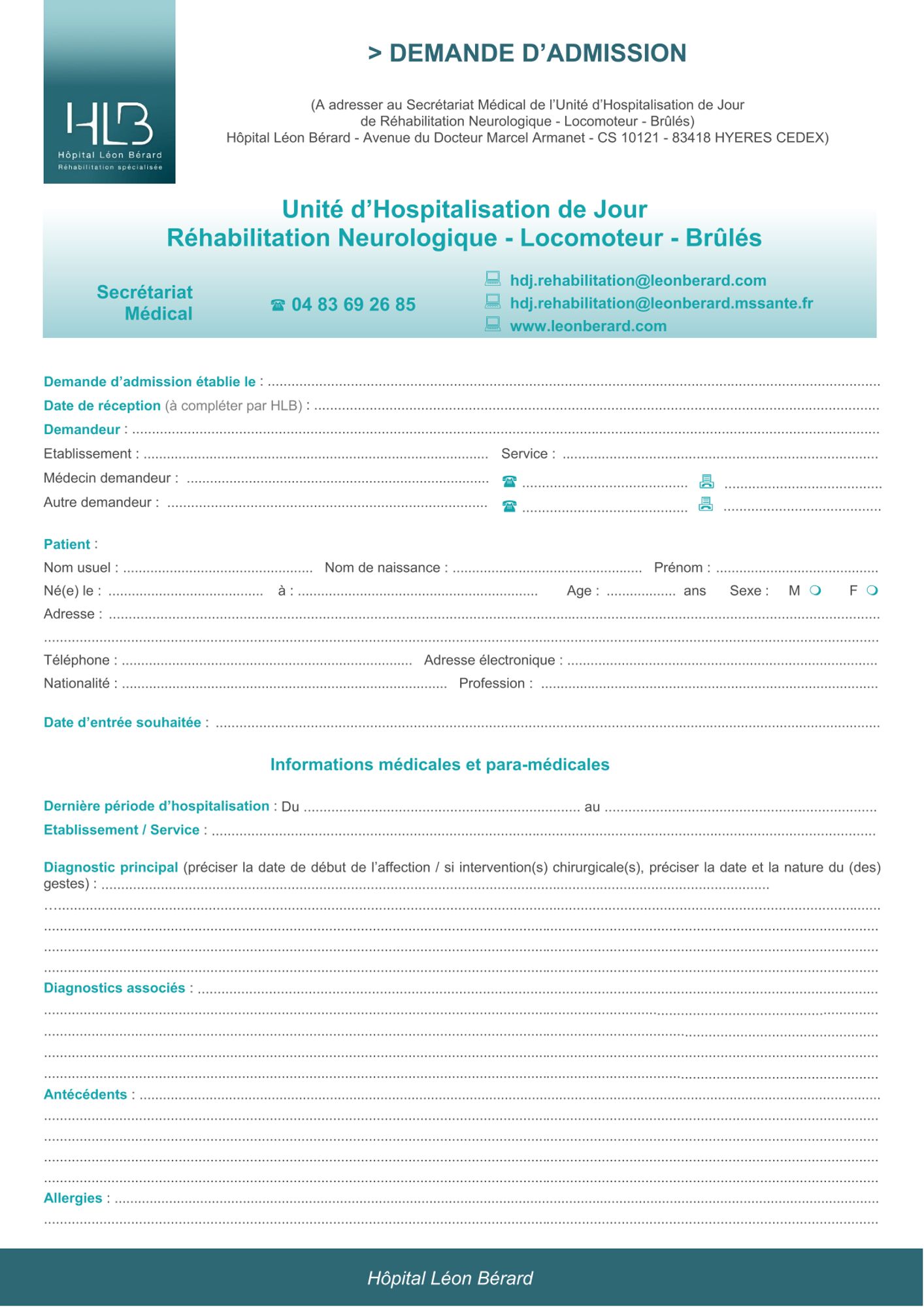 ou par la messagerie sécurisée de santé : hdj.rehabilitation@leonberard.mssante.fr