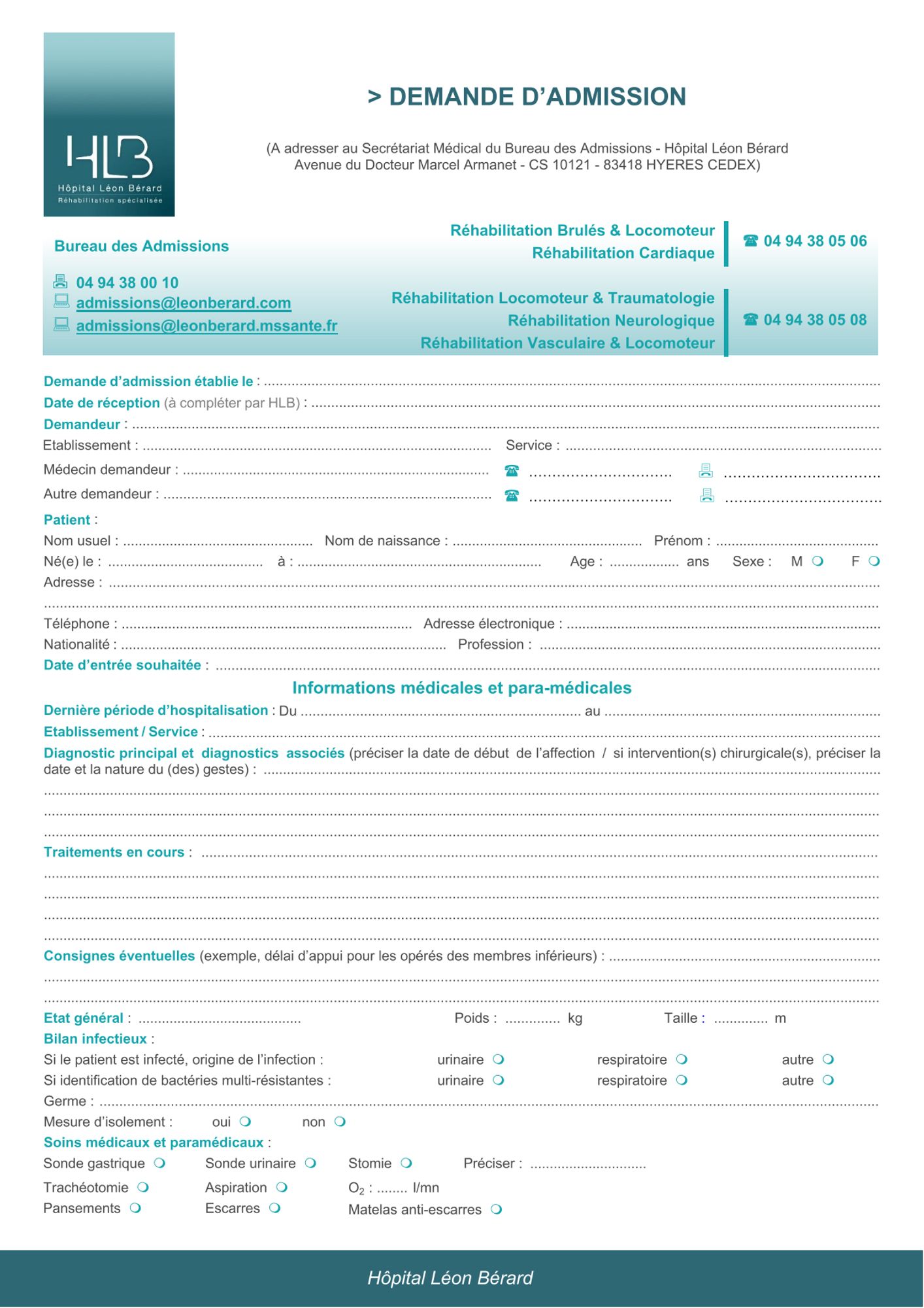 Seules les demandes d’admission justifiées par l’état du patient et correspondant aux orientations médicales de l’établissement pourront prises en compte dans la limite des places disponibles.