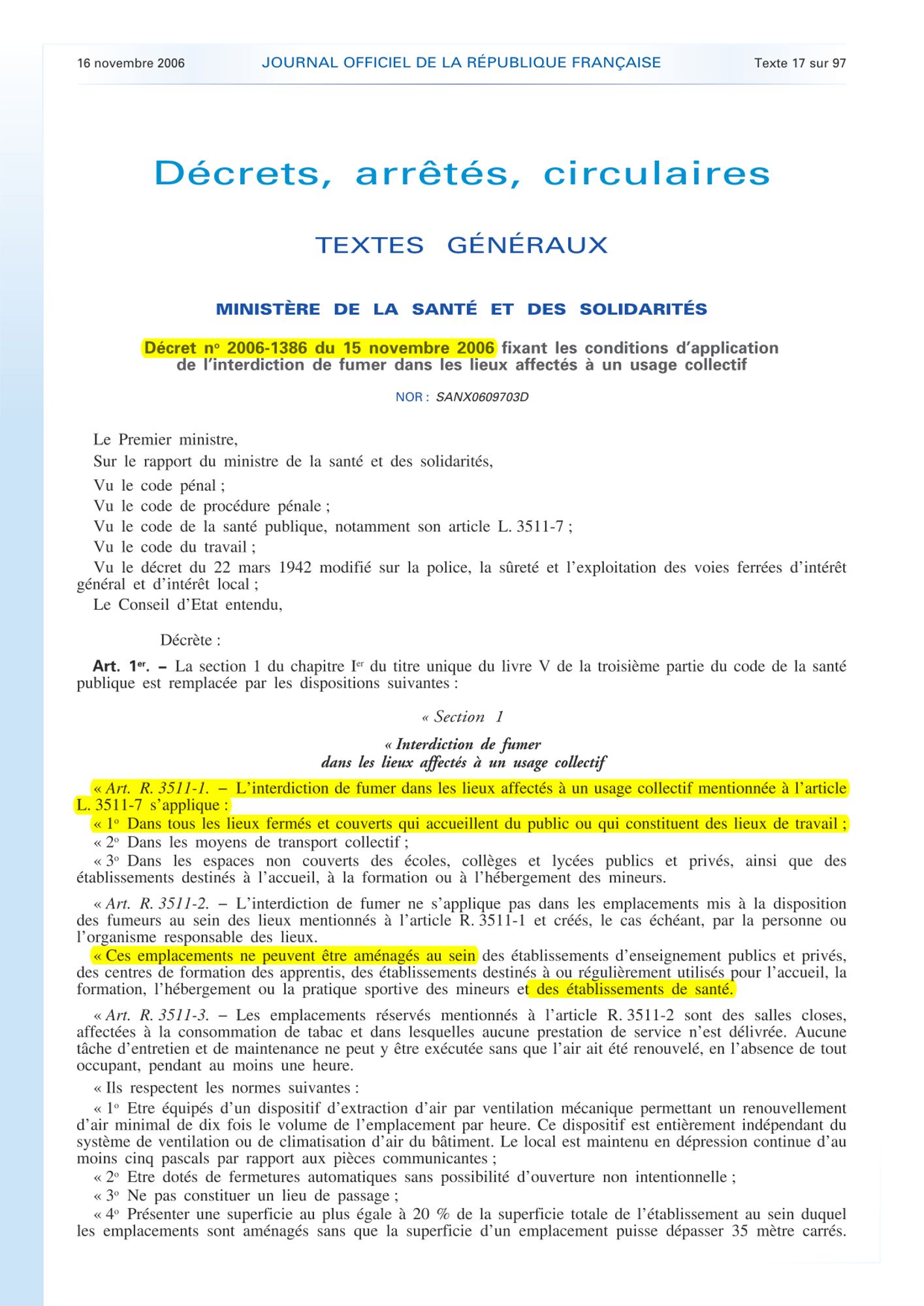 Le Décret n° 2006-1386 du 15 novembre 2006 et la Circulaire du 29 novembre 2006 fixent les conditions d'application de l'interdiction de fumer dans les lieux affectés à un usage collectif.