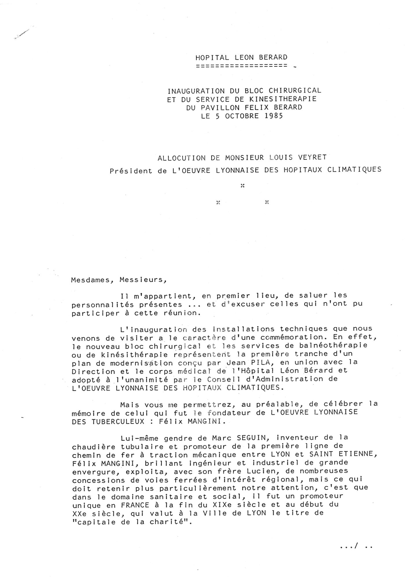 Le 5 octobre 1985, inauguration du nouveau Bloc chirurgical et des services de Kinésithérapie et de Balnéothérapie dans le pavillon Félix Bérard, première tranche d'un plan de modernisation conçu par Jean PILA, Président du Conseil d'Administration de l'Hôpital Léon Bérard jusqu'en 1984, la Direction et le Corps médical de l'Hôpital Léon Bérard, et adopté par le Conseil d'Administration de l'OLHC.