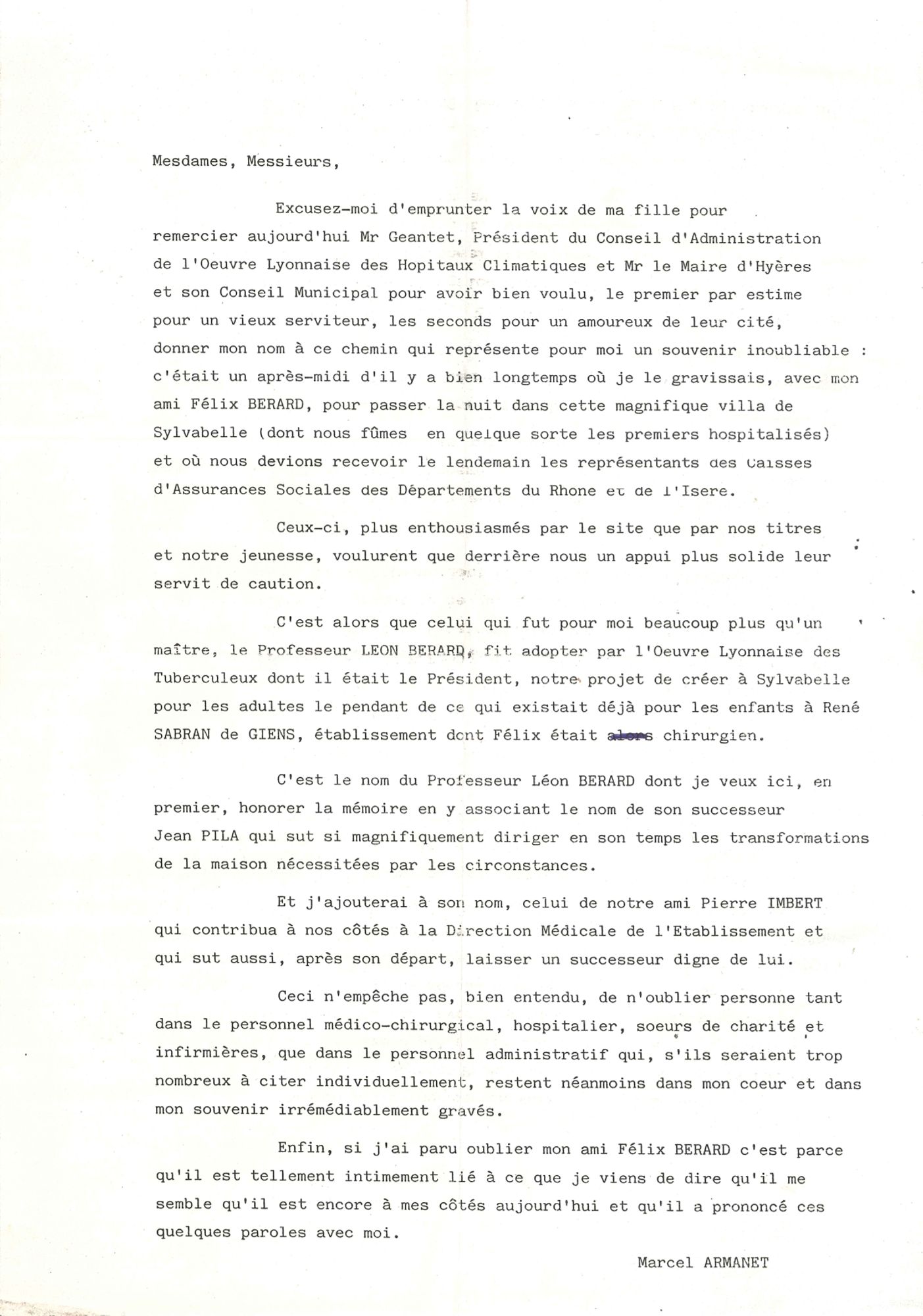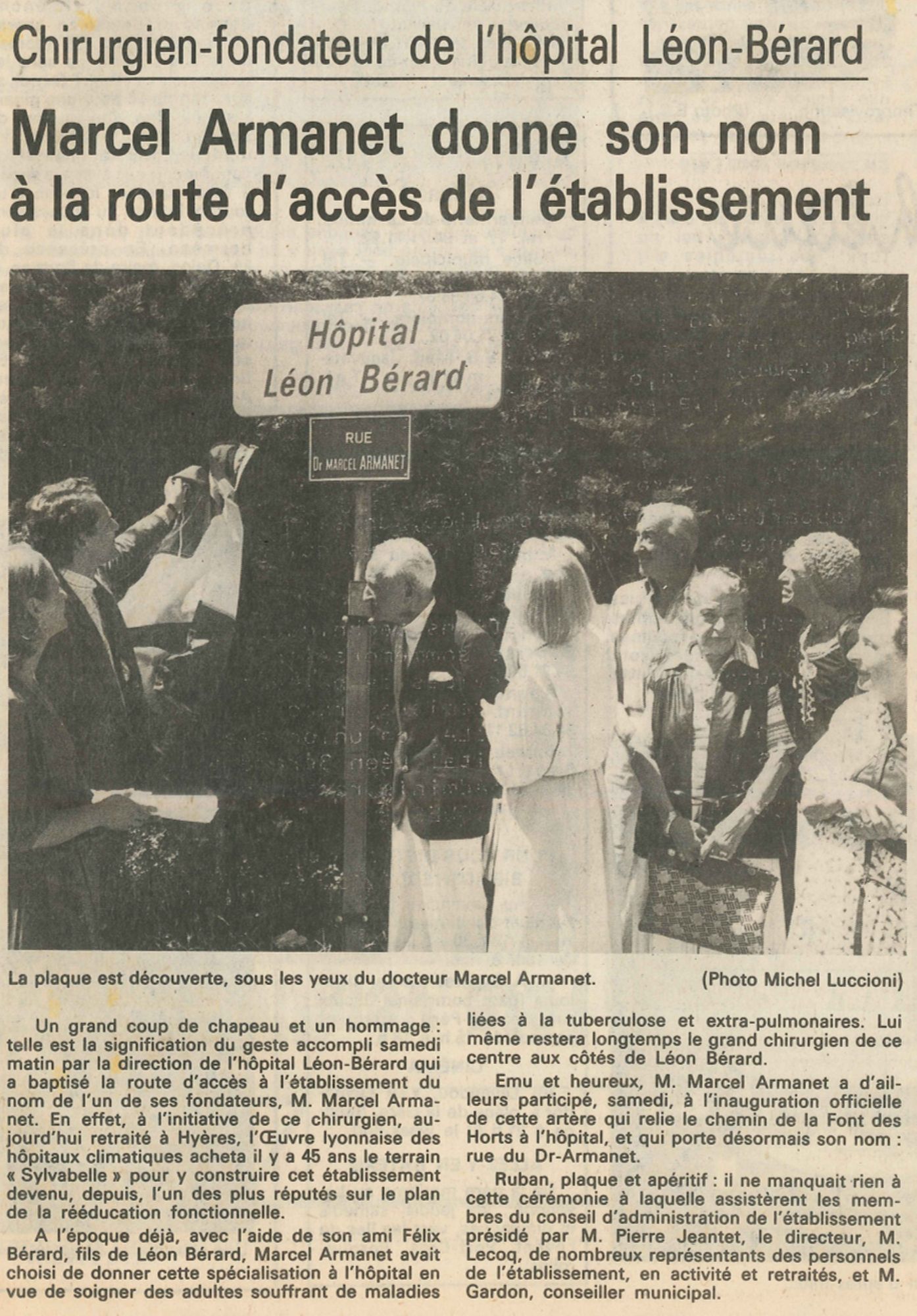 Le 27 juin 1987, la route qui relie le Chemin de la Font des Horts à l'Hôpital Léon Bérard prend le nom de "Rue du Docteur Armanet" et donne lieu à une inauguration officielle en présence de Marcel ARMANET.