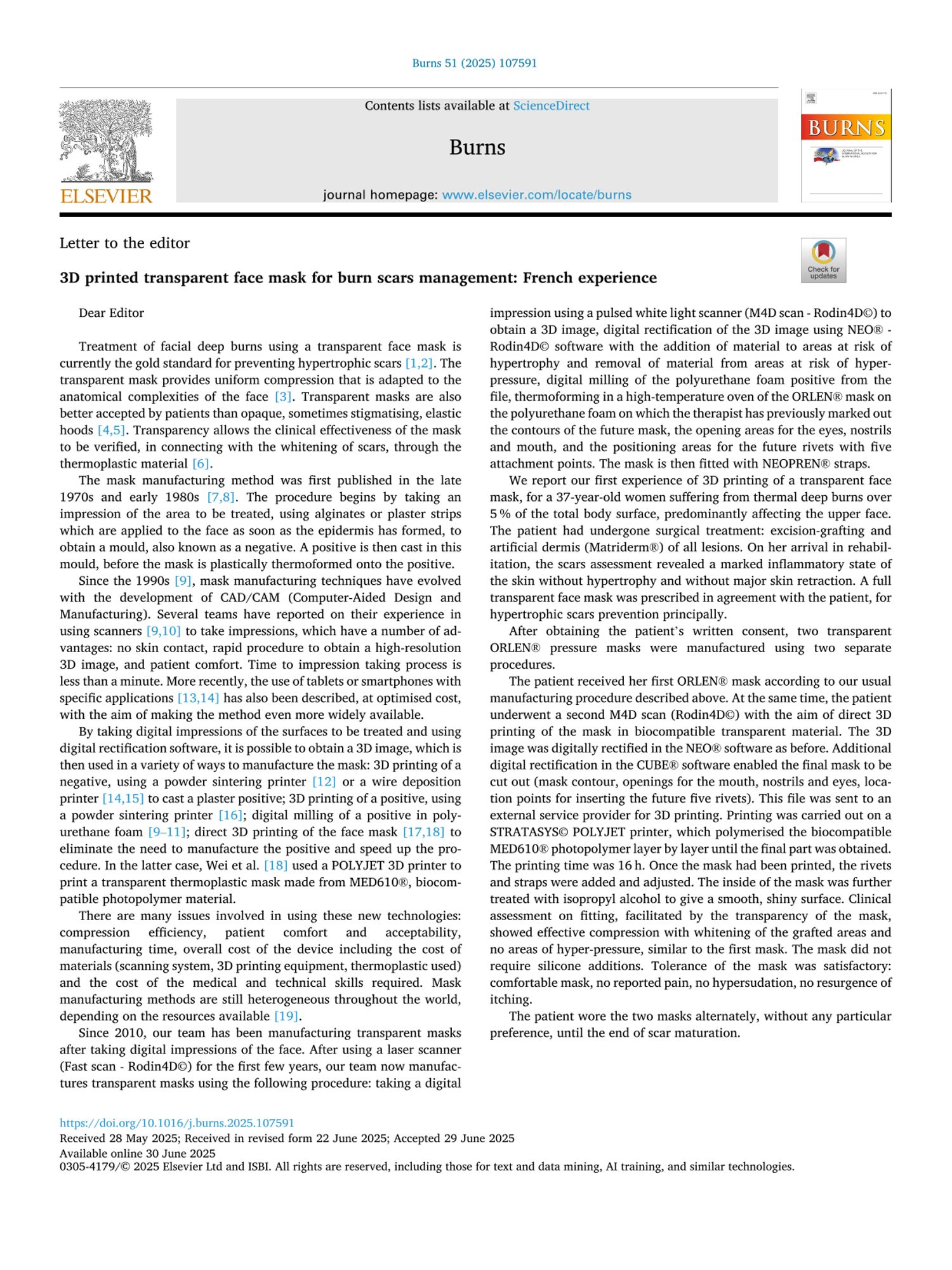 Dans cette lettre à l’éditeur de Burns, l’équipe du Service de Réhabilitation des Brûlés rapporte la conception-fabrication par impression 3D d’un masque transparent à l’attention d’une patiente victime de brûlures profondes du visage traitées par greffe de peau mince, pour la prévention de l’hypertrophie.