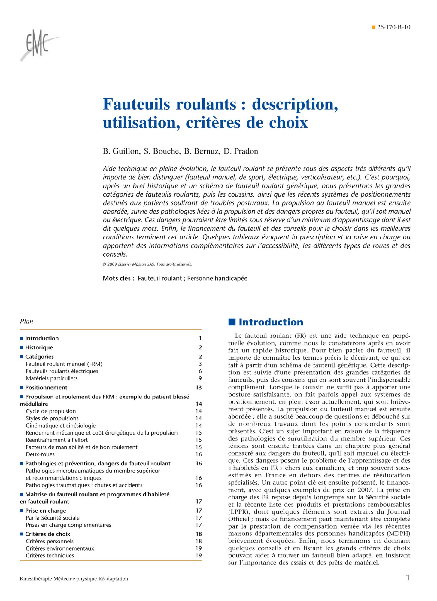 Fauteuils-roulants, description, utilisation, critères de choix EMC Kinésithérapie-Médecine Physique-Réadaptation - Fauteuils-roulants, description, utilisation, critères de choix (3.5 Mo)
