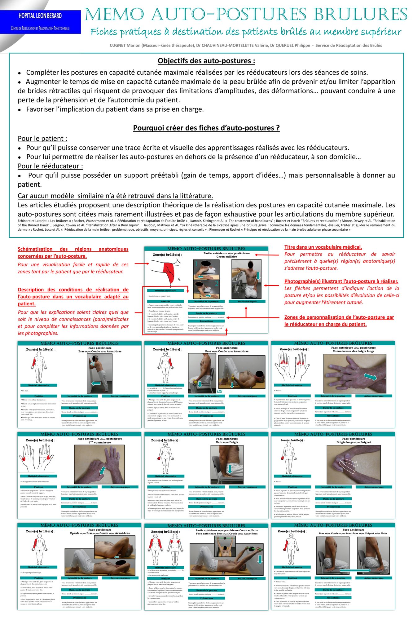 SFB 2019 - Poster - Mémo auto-postures brûlures - Fiches pratiques à destination des patients brûlés au membre supérieur Consulter le poster (989.1 Ko)