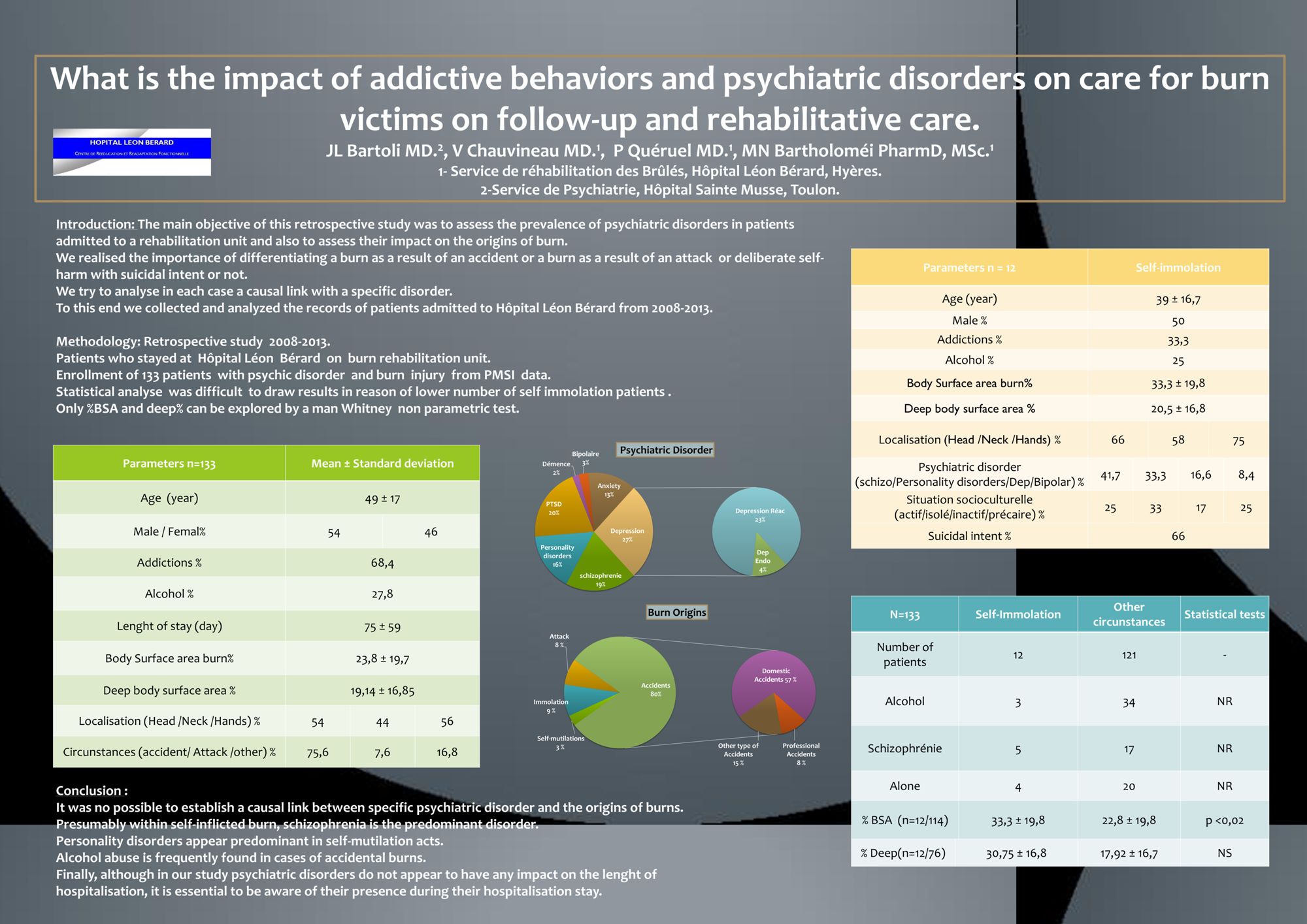 SFETB 2015 - Poster - What it the impact of addictive behaviors and psychiatric disorders on care for burn victims on follow-up and rehabilitative care Consulter le poster (333.2 Ko)