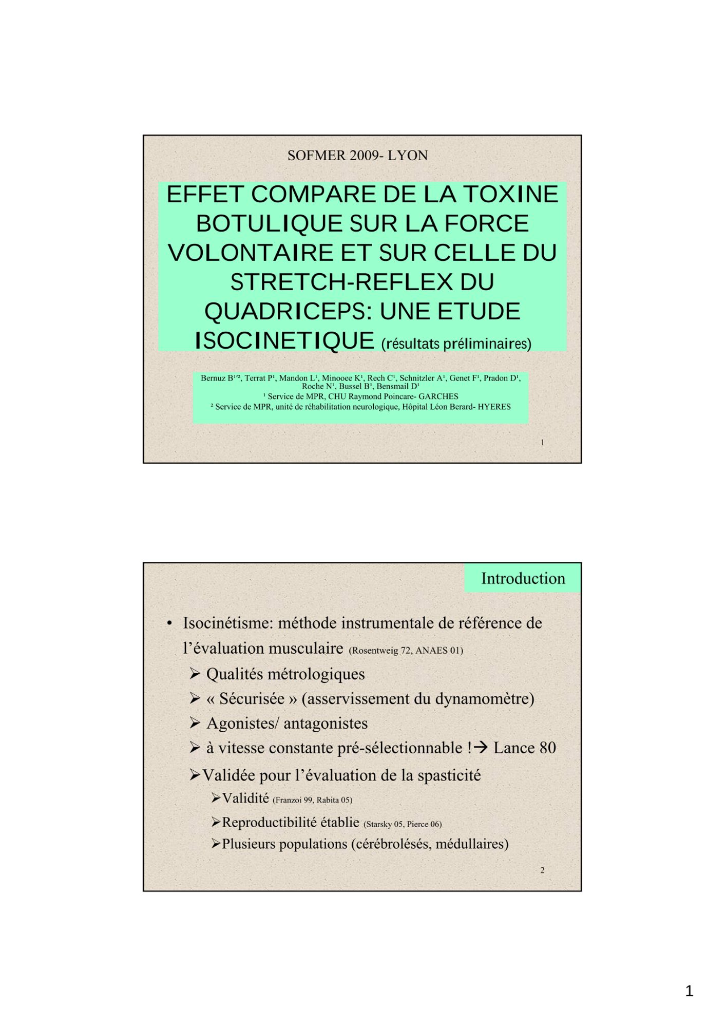 SOFMER 2009 - Présentation - Effet comparé de la toxine botulique sur la force volontaire et sur celle du stretch-reflex du quadriceps - Une étude isocinétique Consulter la présentation (134.8 Ko)