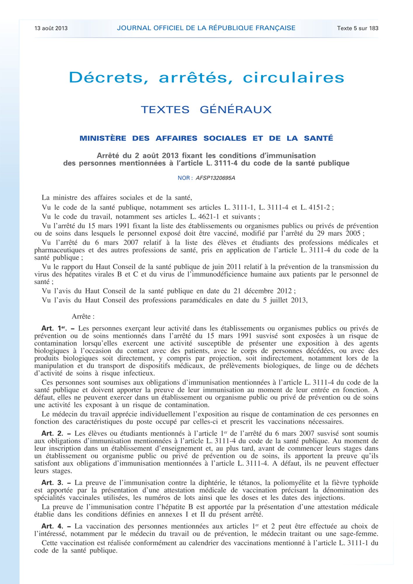 Une personne qui, dans un établissement ou organisme public ou privé de prévention de soins ou hébergeant des personnes âgées, exerce une activité professionnelle l'exposant ou exposant les personnes dont elle est chargée à des risques de contamination doit être immunisée contre l'hépatite B, la diphtérie, le tétanos, la poliomyélite et la grippe.